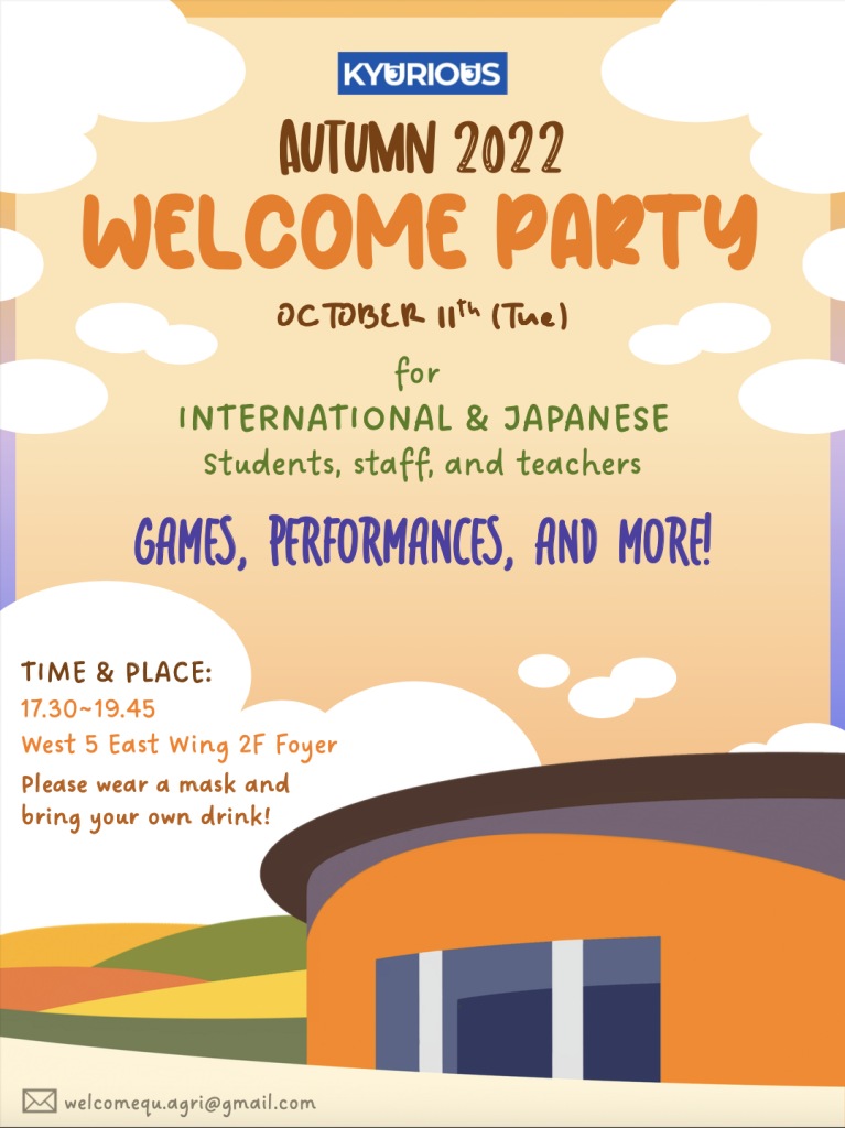 Hello everyone! There will be new students arriving in Fukuoka to start their term at Kyushu university this fall. We are planning a welcome party for our new students on October 11th. The party will be at the foyer on the 2nd floor of the West 5 building. Senior students are also invited.