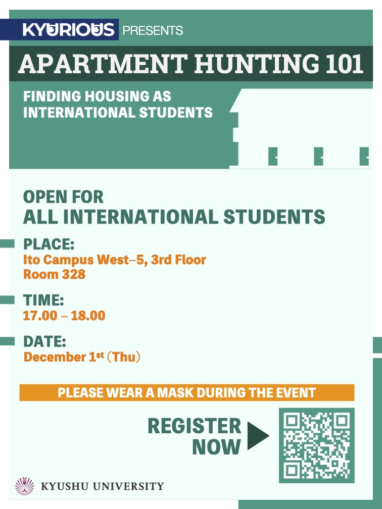 This will be a two-parted event, held on 12/1(Thu), 12/8 (Thu). The first week, we will provide the basic information needed for apartment hunting. In the second week, we will be collaborating with Miyoshi-Fudosan (real estate agent) to introduce international students to their new homes. There will be information about a selection of available apartments and areas.